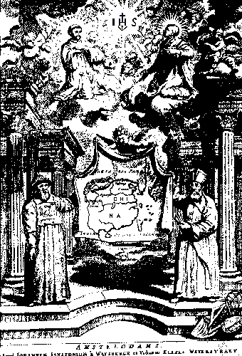 Kircher : China illustrata ; Adam Schall and Matteo Ricci holding a map of China, from China Illustrata, frontispiece. Binding Friendship: Ricci, China and Jesuit Cultural Learnings -