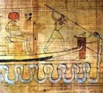 Evenings during sunset, Apophis comes threateningly near to the sun ship before its entrance into the underworld .and he must be fighted from the bow of the ship by Ra/Seth so that the red blood of the Apophis colors the sky. In the mornings during sunrise when the ship comes out of the dark underworld the same battle takes place. (I.e. the symbolism of the change of the snake power into the powers of the wheel).