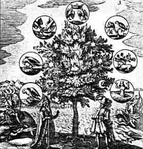Tree of life (Philosophia reformata // Basilius Valentius - Azoth, Paris, 1659) with the 7 steps. In the water : 'Jonas' with the Wal |