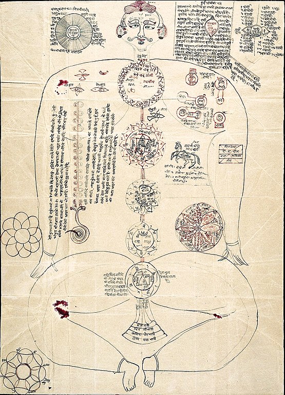 Unidentified, side a, ink, a large line drawing of a man showing the seven subtle centres (cakra) with the body, the main subtle veins (nadi), and the coiled serpent energy at the base of the spine (kundalini). Asian Collection |